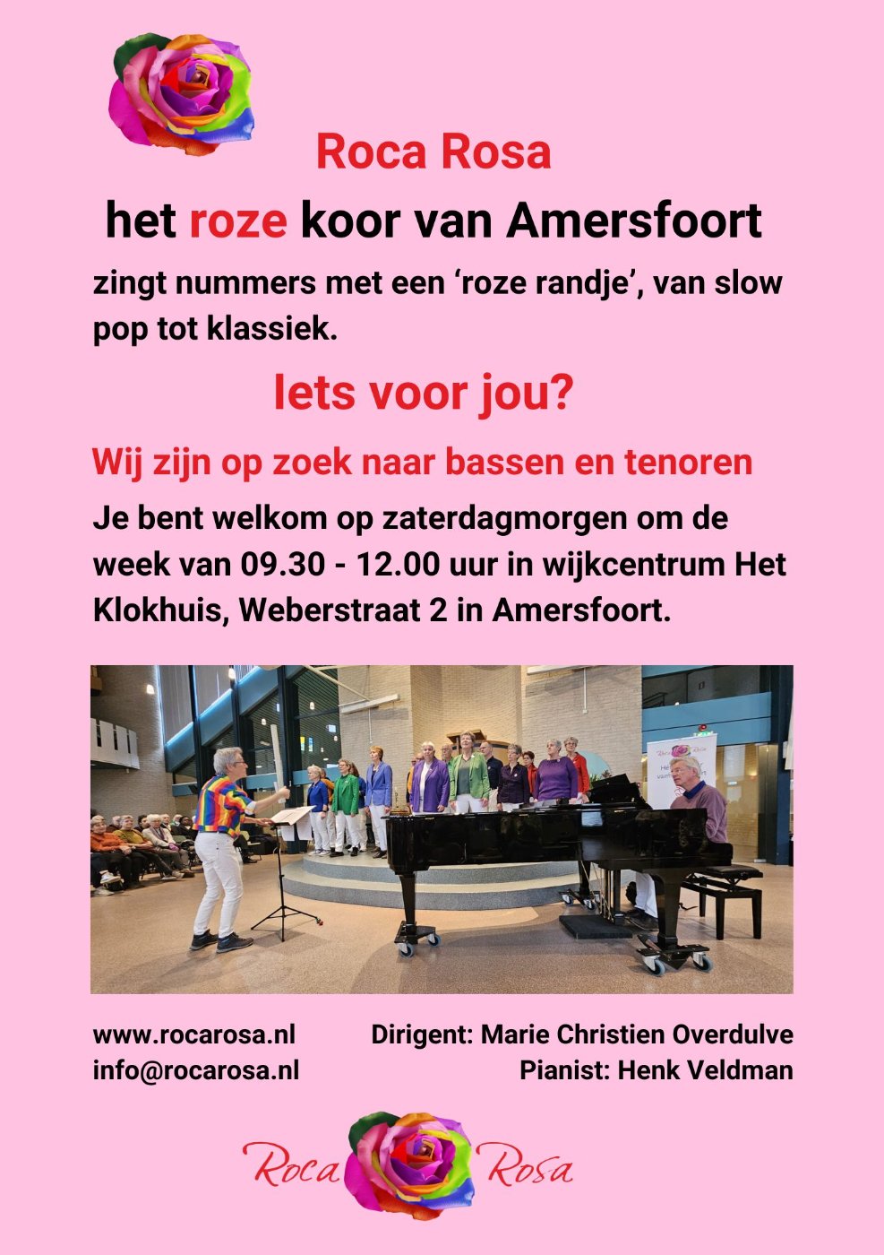Als het je leuk lijkt, voel je welkom om eens mee te komen doen op een repetitieochtend. Er is zeker nog plaats voor enthousiaste zangers en zangeressen die een ‘roze hart’ hebben.