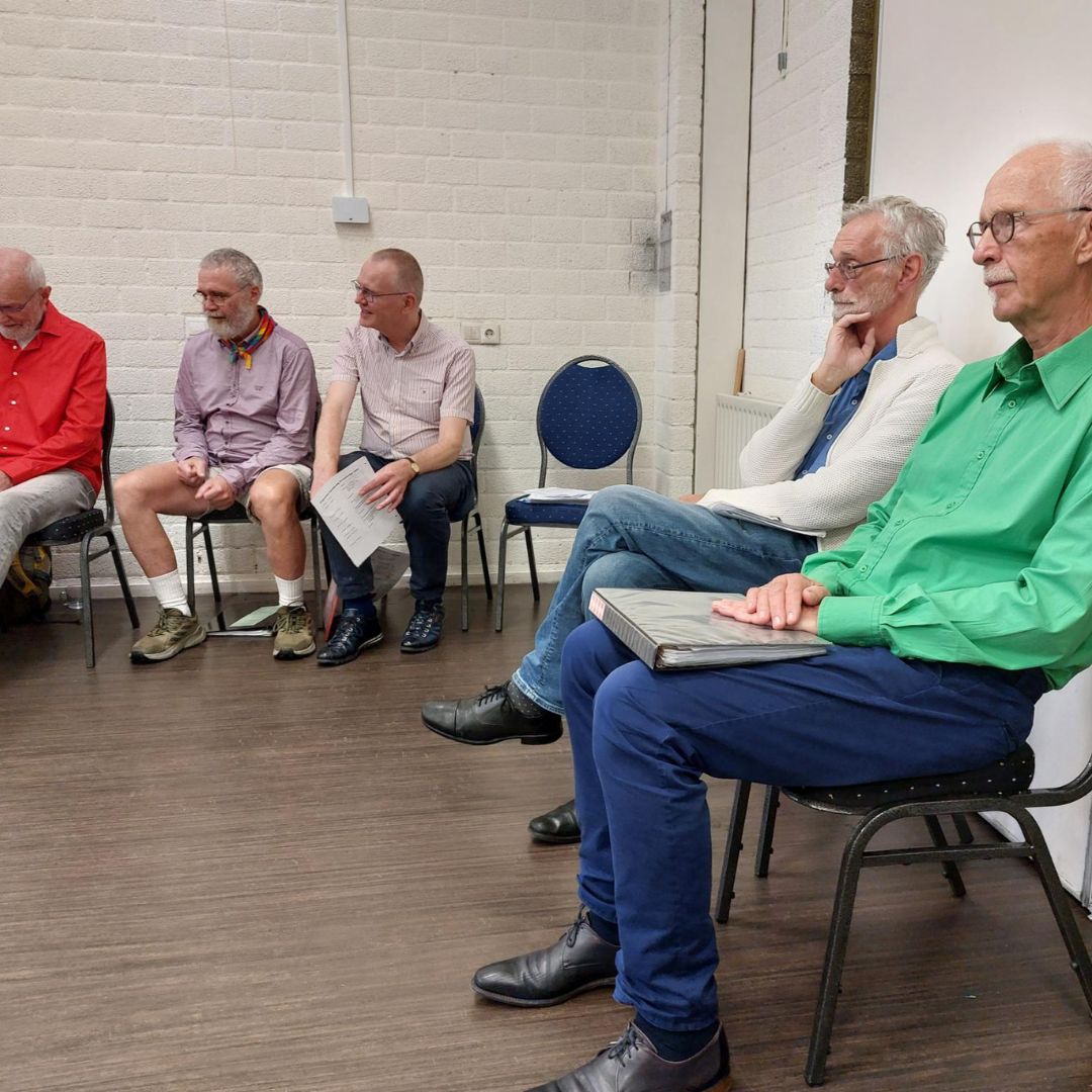 Gelijk vol van start met het repeteren van de nummers die we op Coming-Out day, 11 oktober, in Nunspeet gaan zingen.